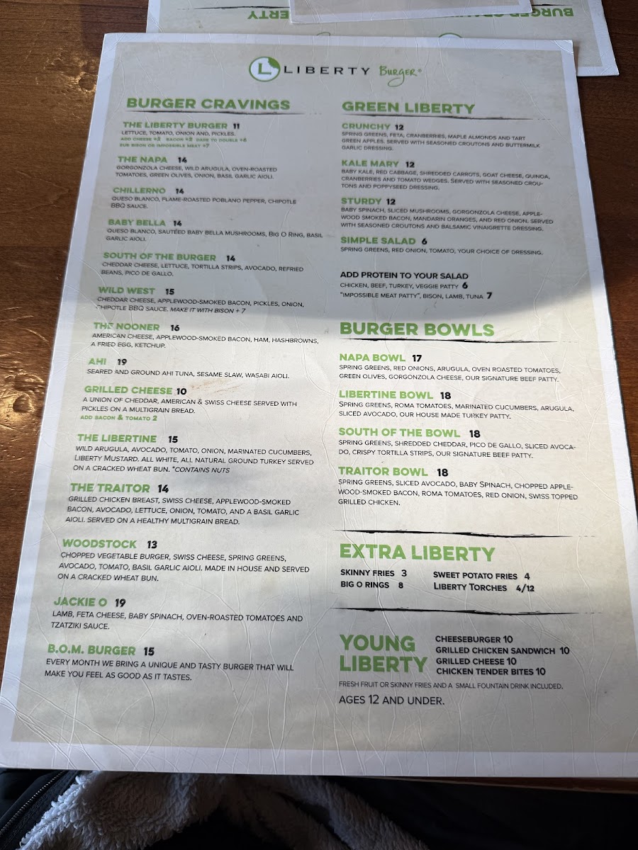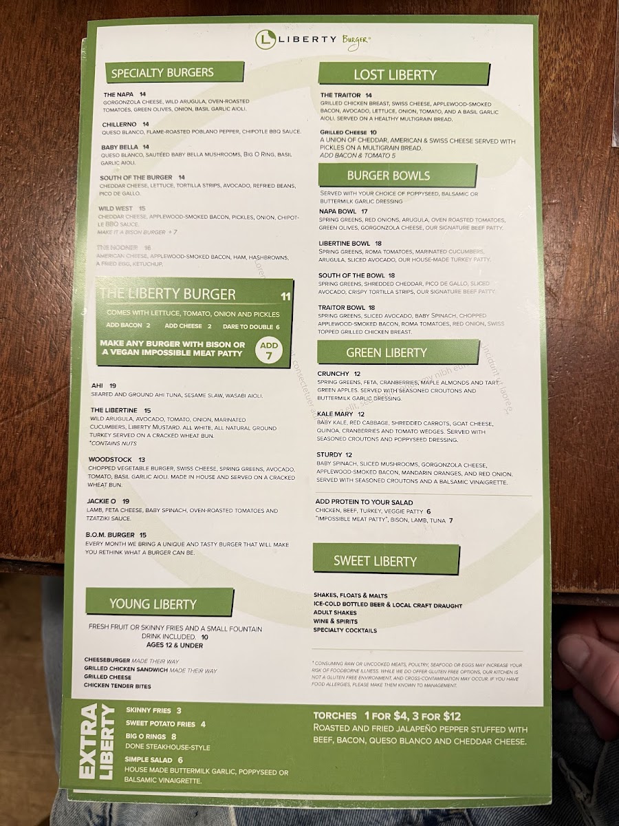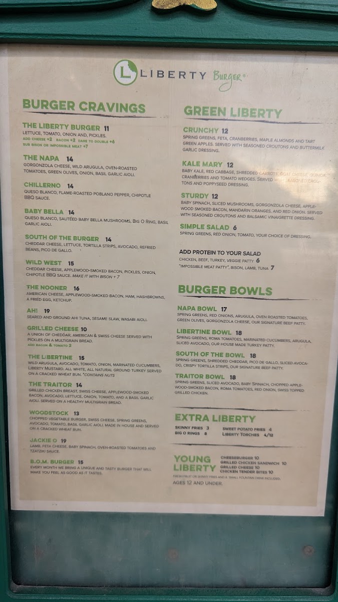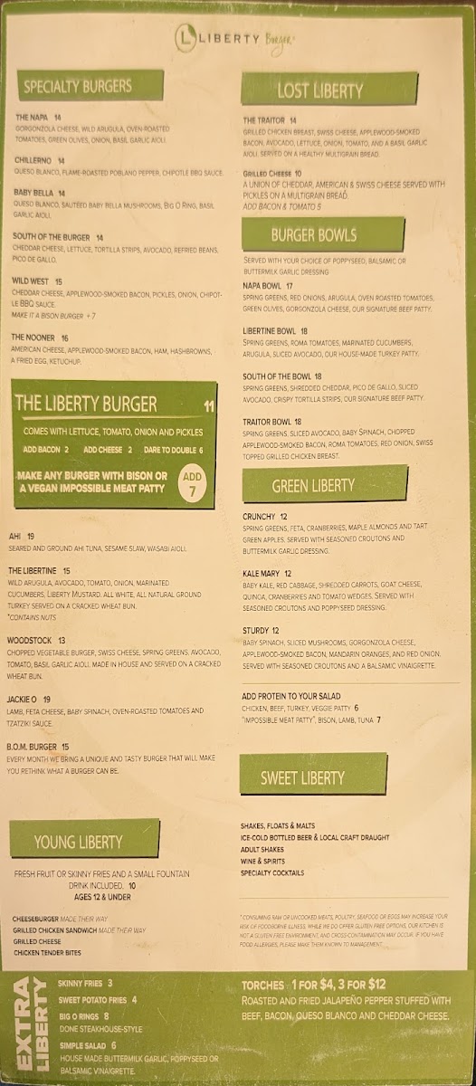 Welcome to Liberty Burger, your go-to destination for mouthwatering burgers in a cozy setting. Known for its inviting atmosphere with original tin ceilings and a consistent color palette, Liberty Burger captivates guests from the moment they step inside.